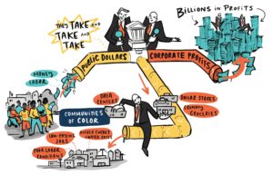 Then the second part of the question, I think, is more important: who has the power and who doesn’t have the power? The main thing that these monopolistic companies want to do is to extract. These are extractive corporations. They want to extract your labor. They want to extract wealth. They want to extract your resources. That’s their whole goal, and they don’t make these supersized profits any other way. So they tend to target communities that they think have the least amount of power to fight back against that extraction.